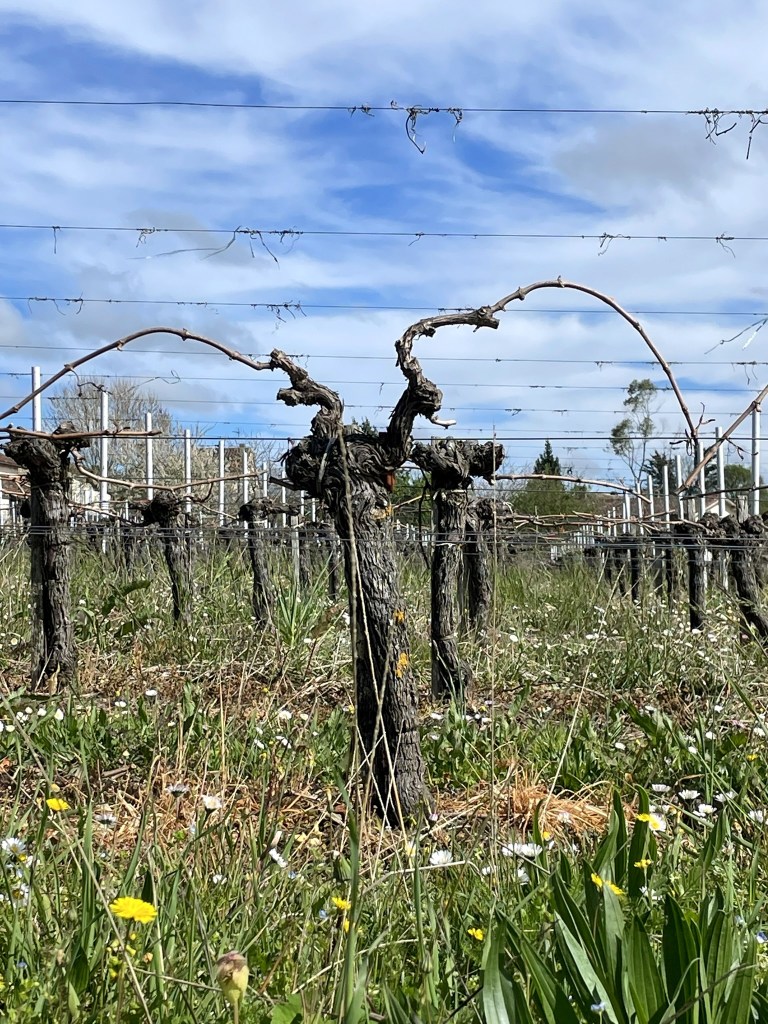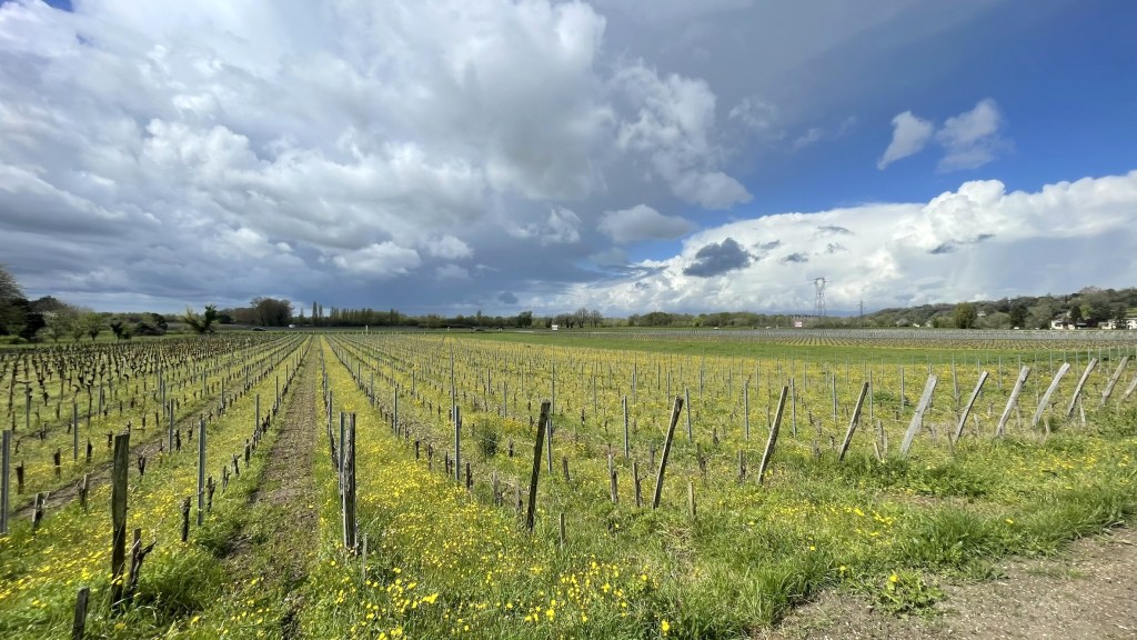 Staying in Saint-Germain-de-la-Rivière, we were surrounded by the everyday work in the vineyards. We saw people working in torrential rain to finish winter pruning. The vineyards don’t look too impressive at this stage… rows of gnarled brown stumps. But on closer inspection, the vines had emerged from winter dormancy and started budburst, when buds swell and open, and green shoots start to show. In 2021, budburst came early, due to very sunny weather in March, followed by severe frosts in early April, reducing yields across the entire Bordeaux region. Climate change is causing warmer early spring temperatures, which can easily be followed by a cold snap in April or even May, so the risk of frost is significant – especially for Merlot, which is an early-budding variety. This year, the rain during March led to flooding on flatter sites closer to the river. Waterlogging reduces the amount of oxygen available to the vine roots, slowing down growth. It also leads to compacted soils, making them difficult to work. The best vineyard sites are on well-drained slopes, but we saw a fair few hectares under water throughout Fronsac.